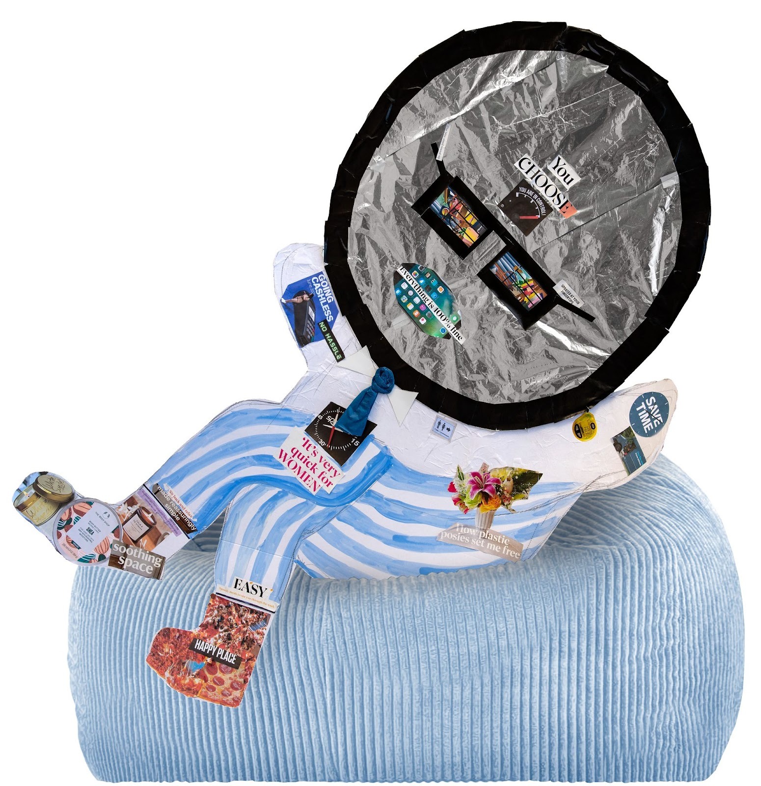 When, as Larks & Ravens, we are making any of our ‘cardboard gods of our time’, we rarely have much idea at the outset of what any of them will look like. They emerge, almost magically, through the making process …from initially cutting out the cardboard to collaging with images and quotes which happen to jump out at you. So, Convenience materialised as a god who lives a recumbent, relaxed existence with everything available to him at the simple touch of a button the size of his head.