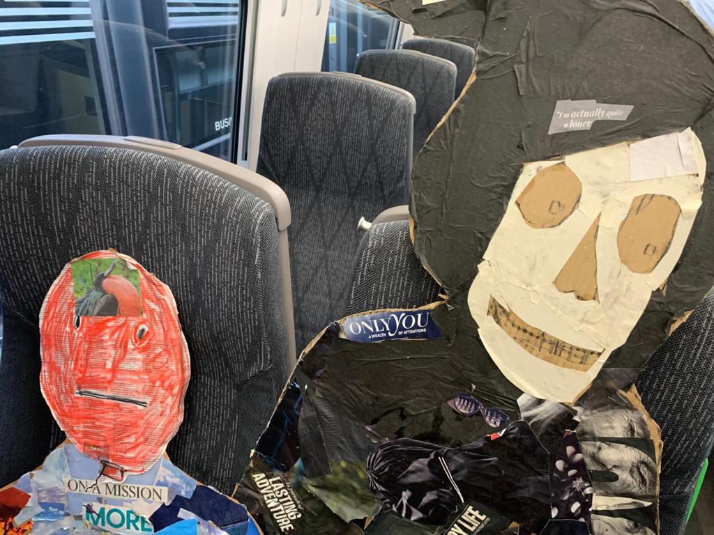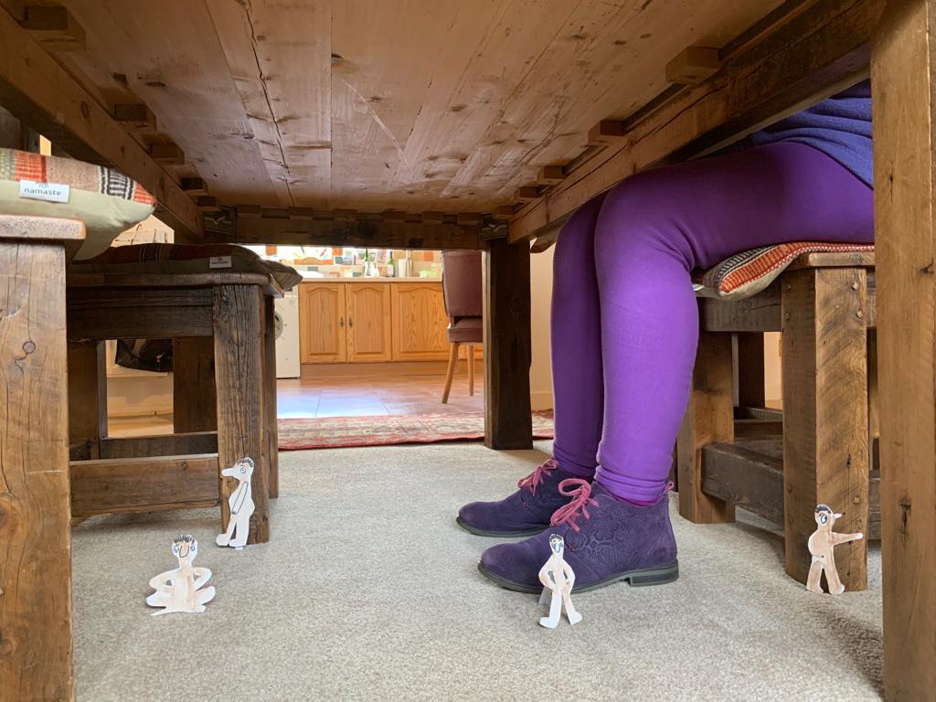 Last week we had an impromptu get-together of the various cardboard ‘gods of our time’ which we’ve so far made. A few of the original ones are looking a bit tatty round the edges as a result of their various adventures. Poor old Lady Justice now has to travel in two halves. But hey, that’s the natural process of ageing – human or cardboard.