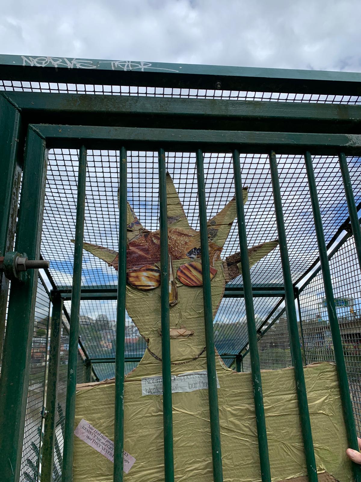 Our original cardboard goddess ‘Lady Justice’ has become a bit battered over time & has lost some of her body parts but she still has a powerful presence! We took her along with Lady Luck and a god of Growth on a walkabout in Bristol last Thursday. We were curious about placing one or other of the gods in locations we happened to encounter.