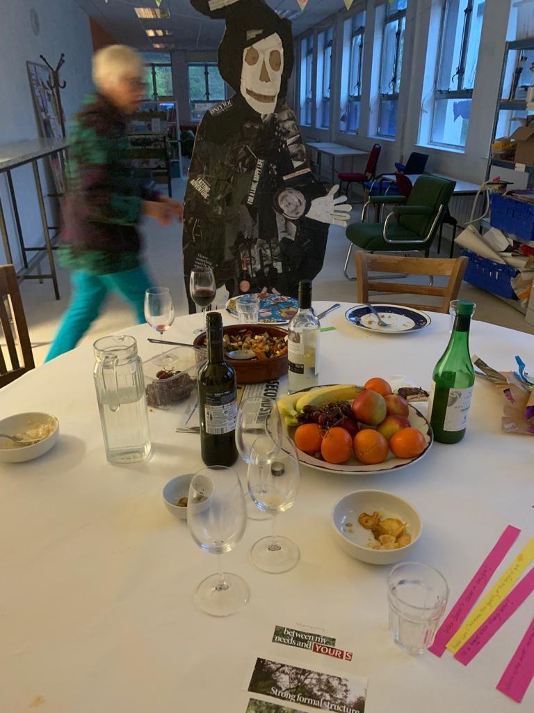 In preparation, alongside honing our pie making skills & recipes, we found ourselves creating 3 lifesize “gods” to oversee the suppers, namely: Death, Lady Justice & Lady Luck – each bringing their own mythical perspective to fair pie sharing. How do we balance the power of Lady Justice carefully weighing the deserving vs the undeserving with the capricious Lady Luck handing out fortune on the basis of luck alone?