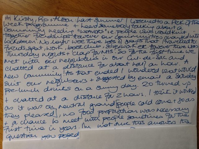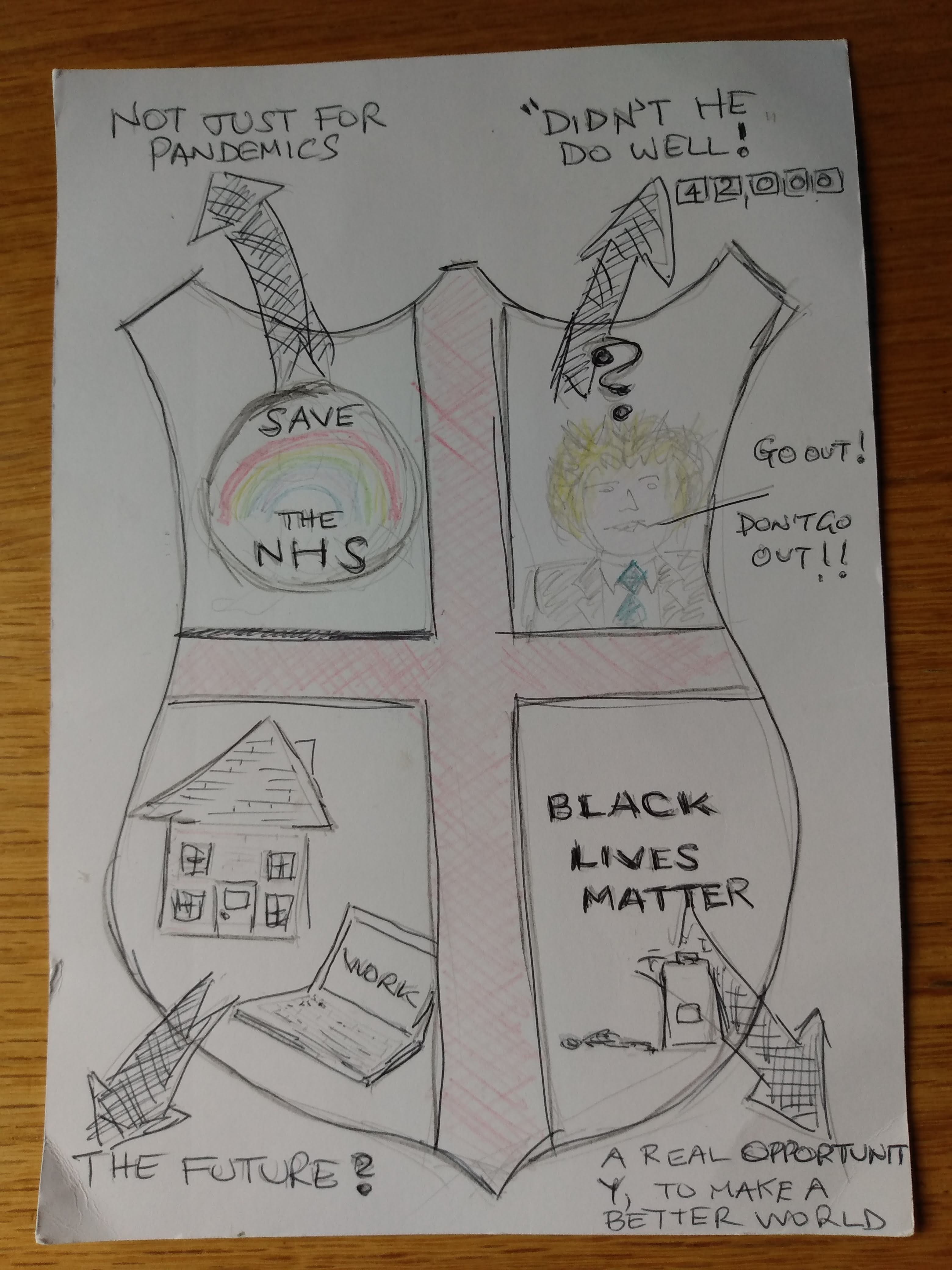 In May, we are distributing (by any means we can find in our locked down world), postcards inviting responses which can make and remake thinking and action. As we receive these, we will combine reflective drawing, making, words and psychology to respond and, we hope, continue a wider conversation.
